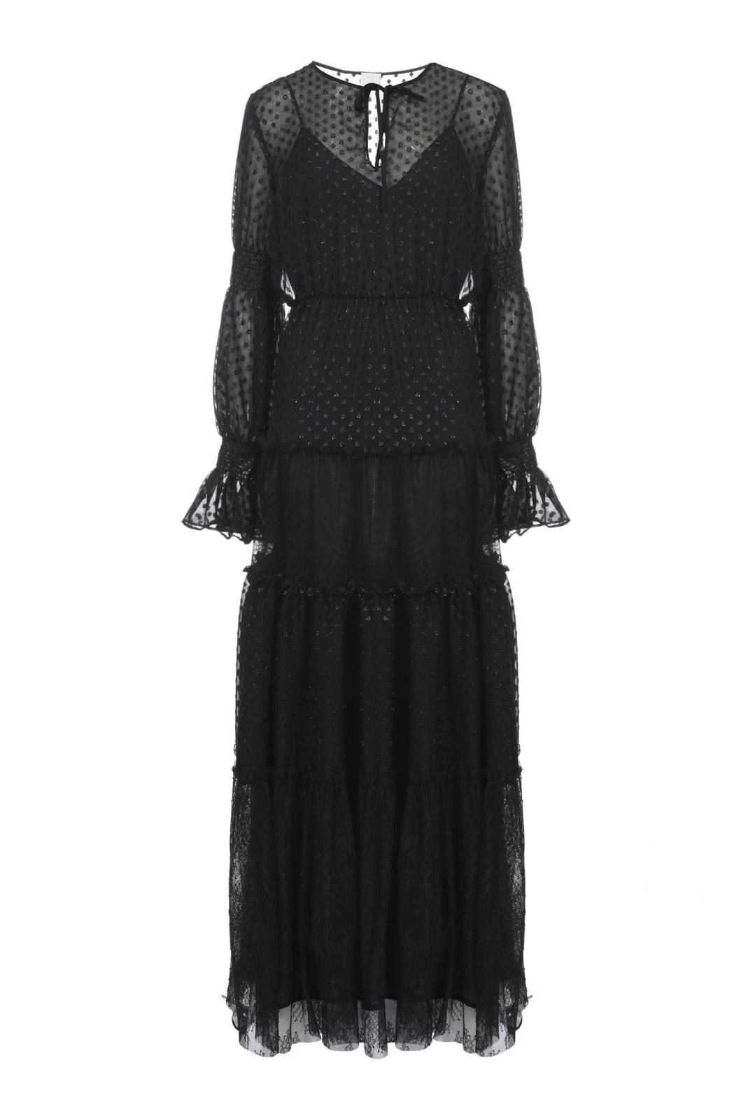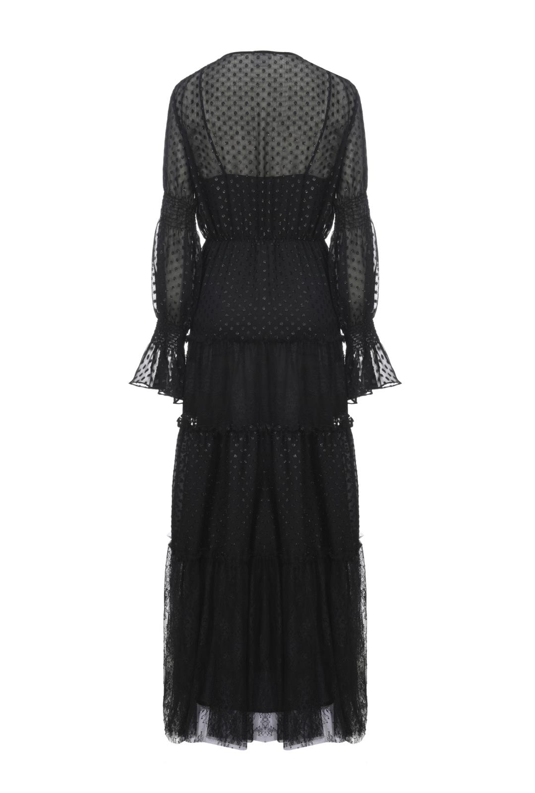 Taglio boho versione dark per un long dress dall'appeal gothic-romantic. Giochi di trasparenze grazie al tessuto plumetis leggero, doppiato su top lingeria. L'alternanza di arricciature, balze e volants à la française sono il vezzo femminile che non può mancare.