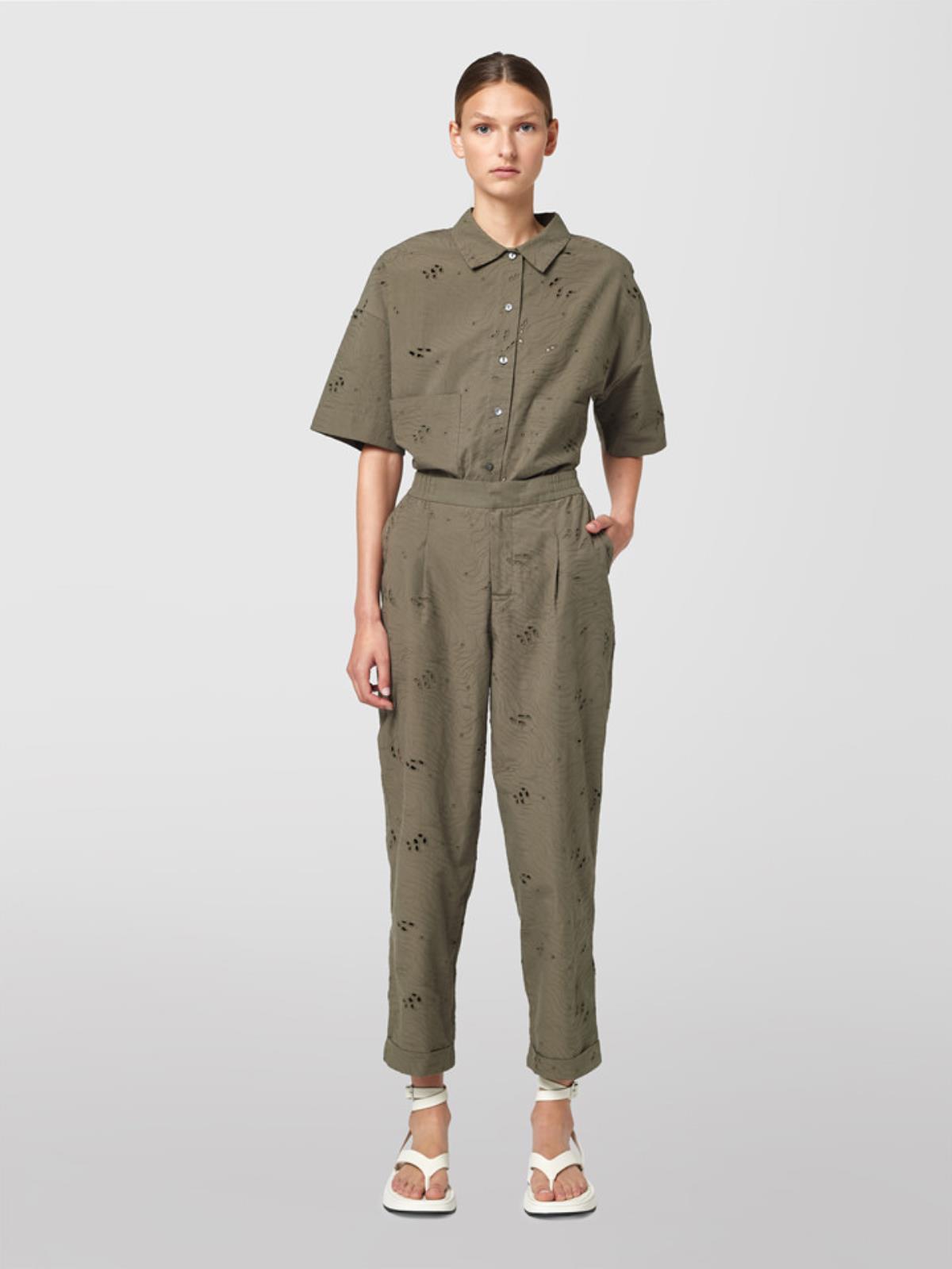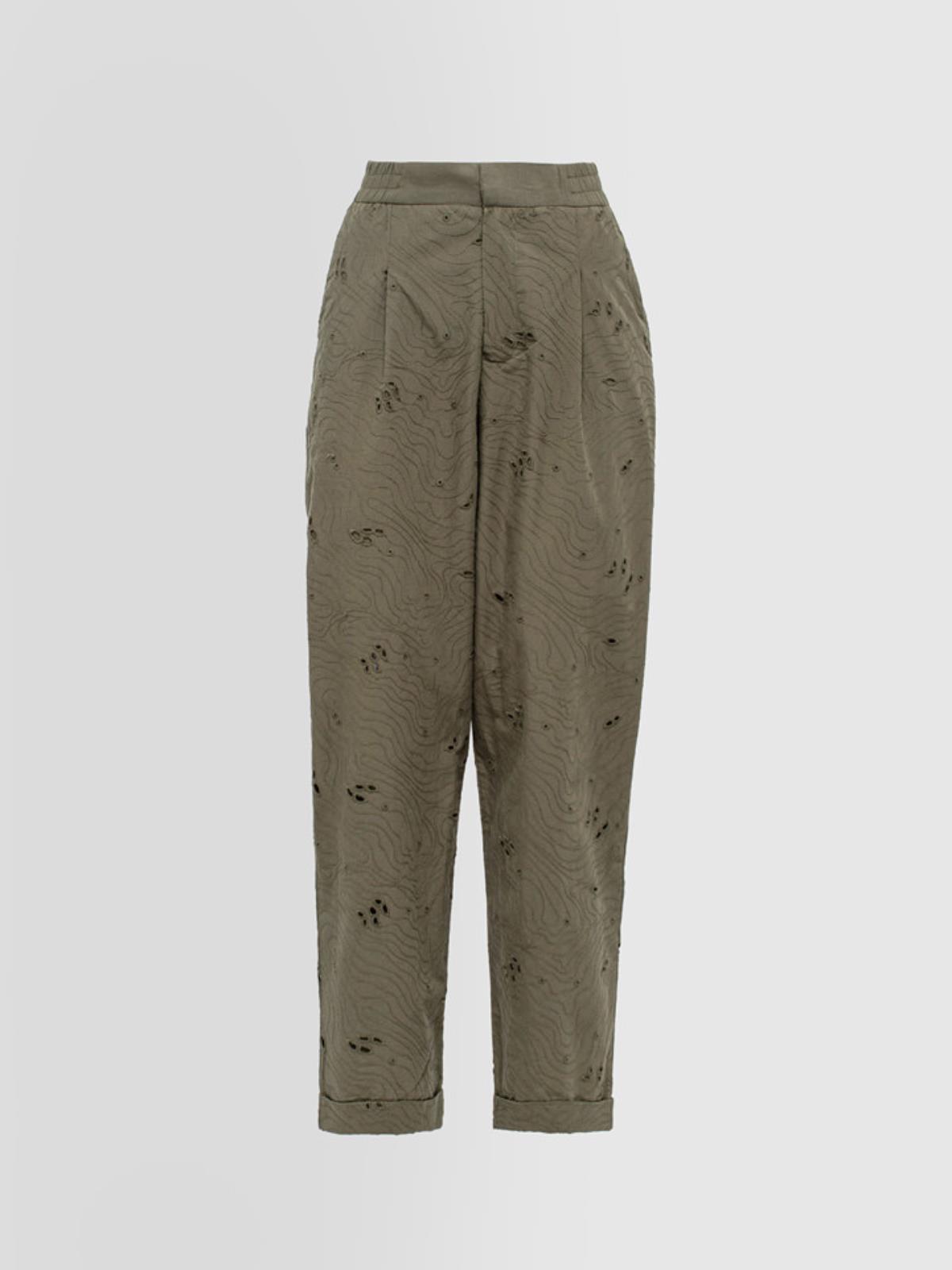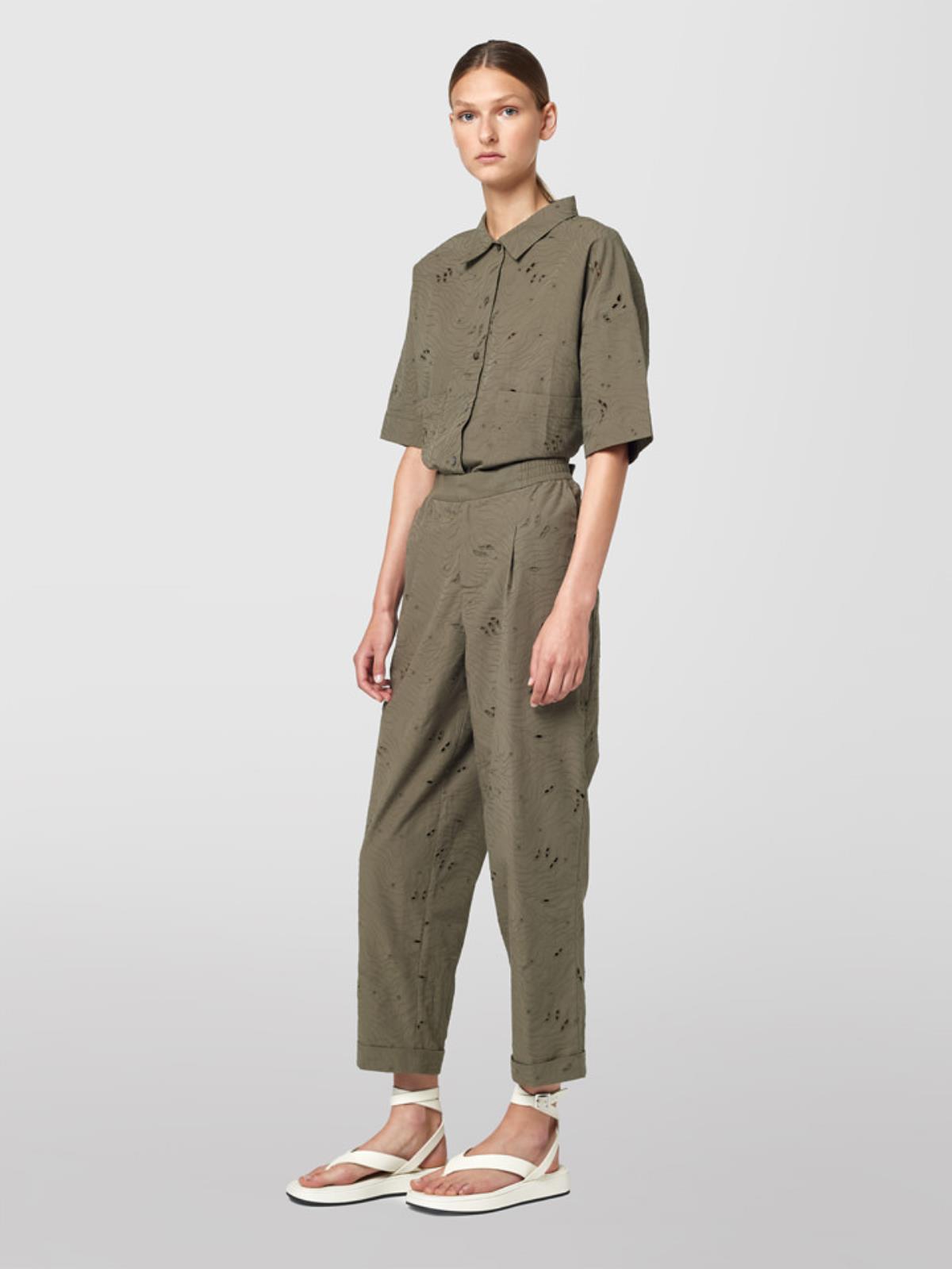 Pantalone pinces in popeline di cotone lavorazione sangallo. Vestibilità regular a vita alta con elastico inserito. Chiusura con gancio interno in vita e zip, tasche all'americana sul fronte.
