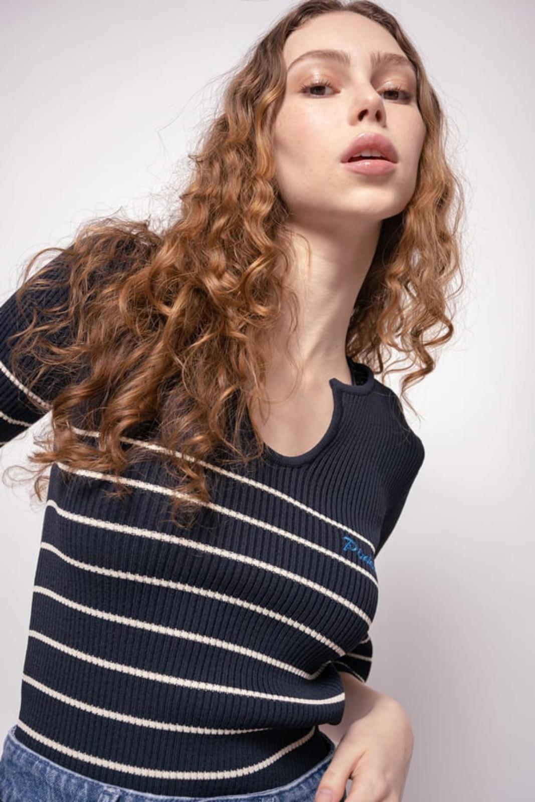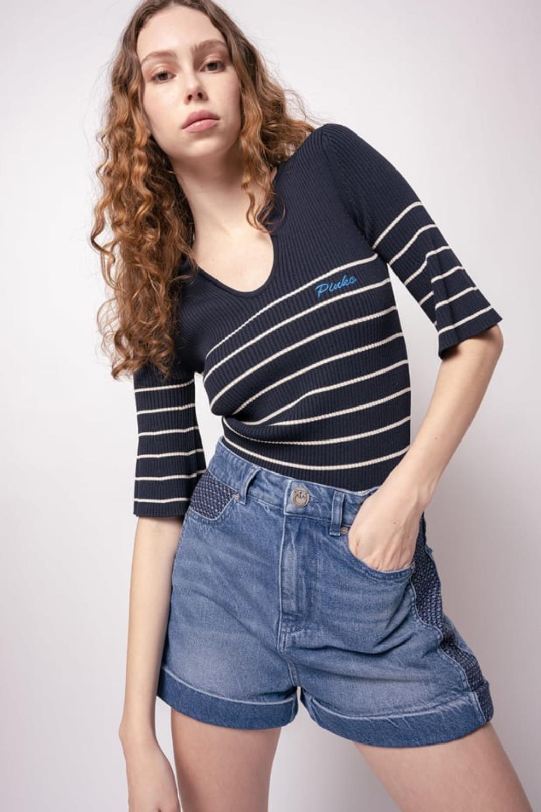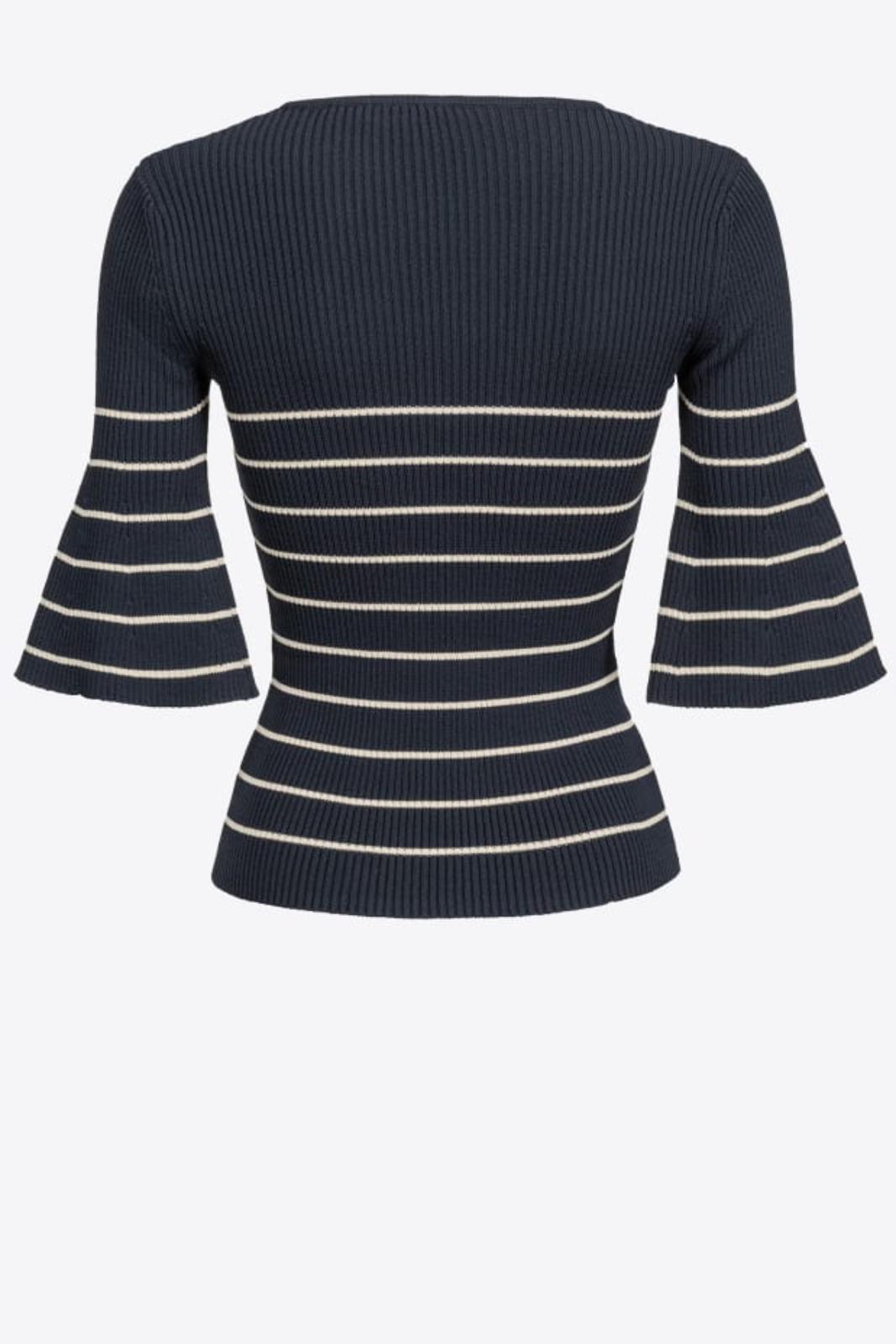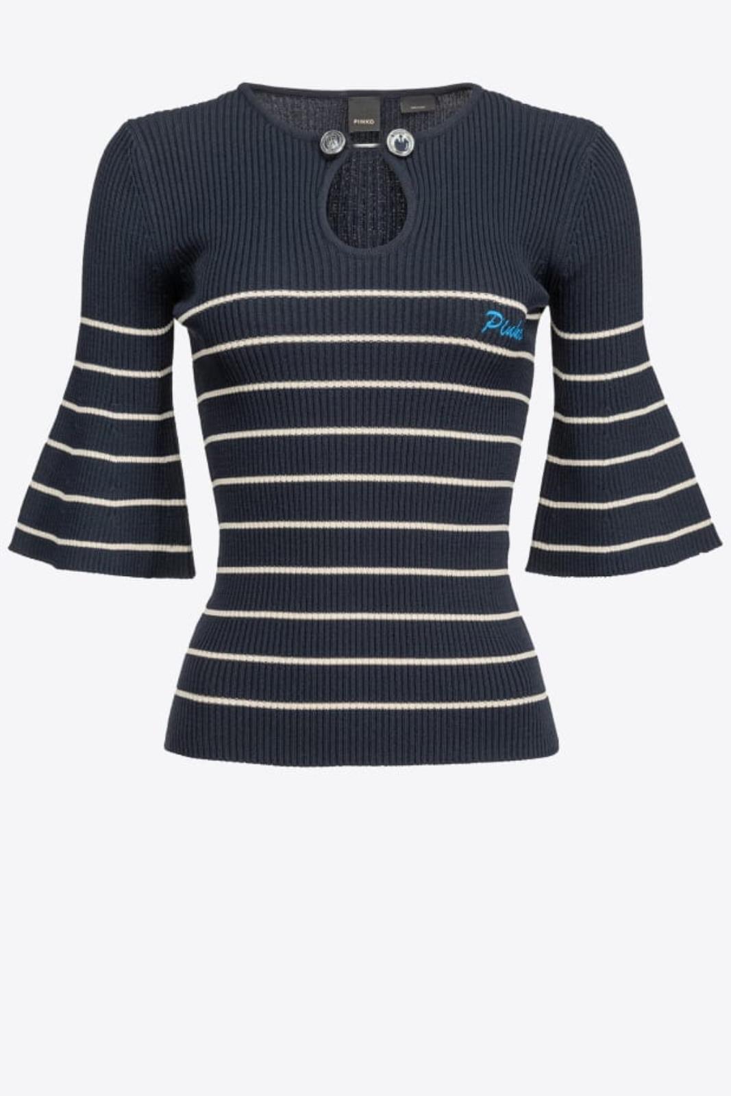 Maglia aderente lavorata a costine con righe a contrasto orizzontali. Scollo a goccia chiuso con bottoni in metalllo, maniche tre quarti dalla linea svasata sul fondo. Logo ricamato sul davanti.
