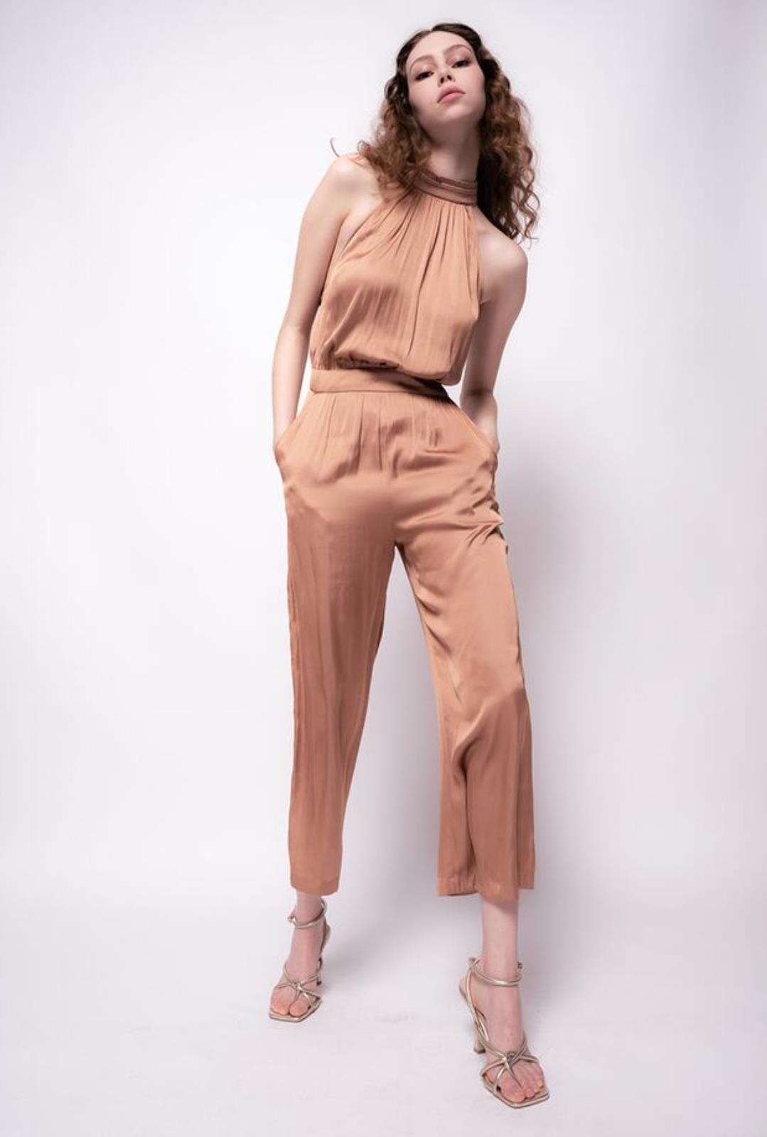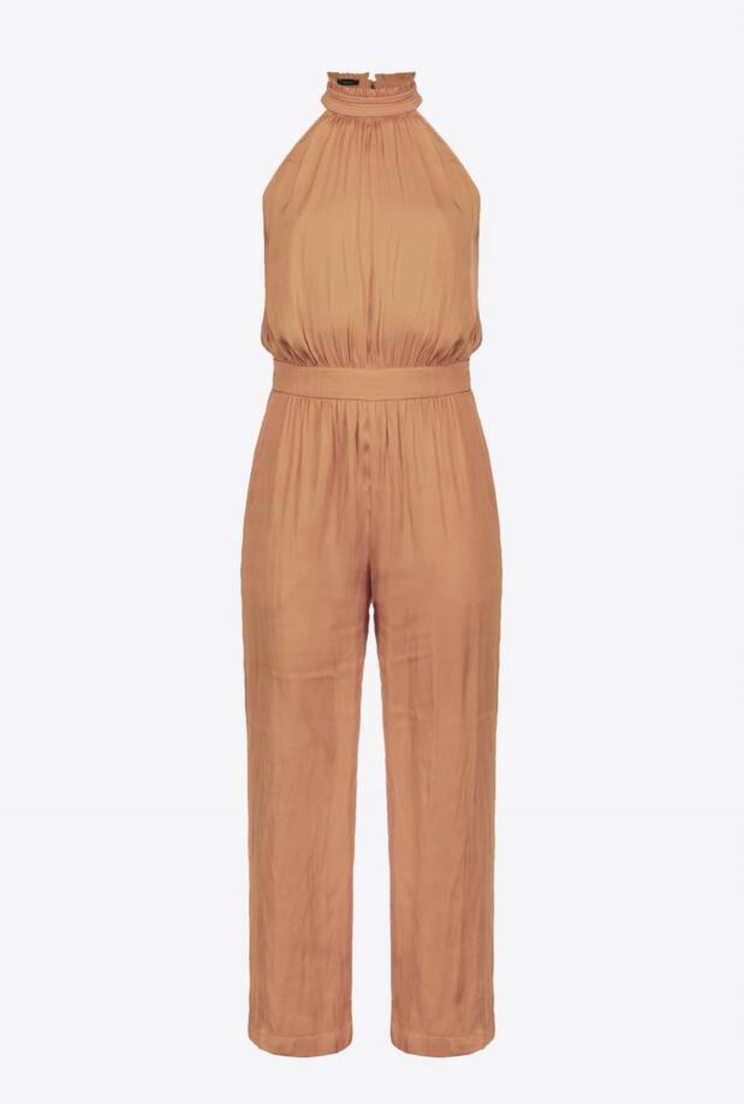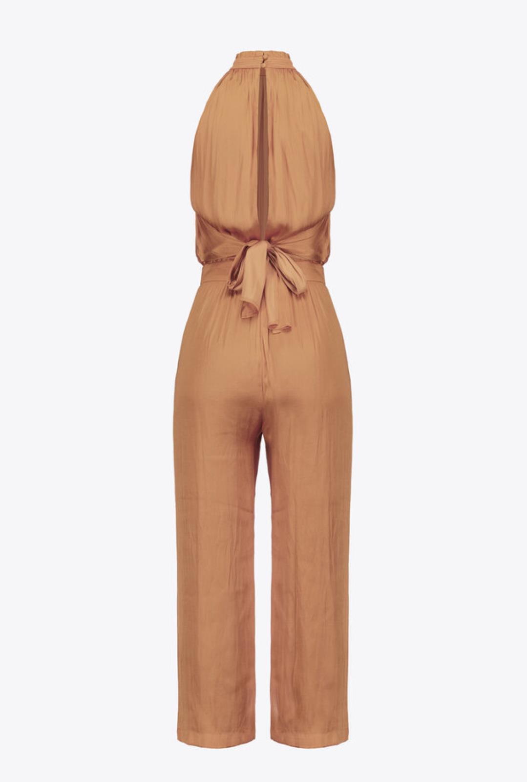 Tuta lunga senza maniche in raso ultralight. Scollo all'americana allacciato sul collo dietro con due piccoli bottoni e fascia effetto cintura in vita, da annodare sul retro.